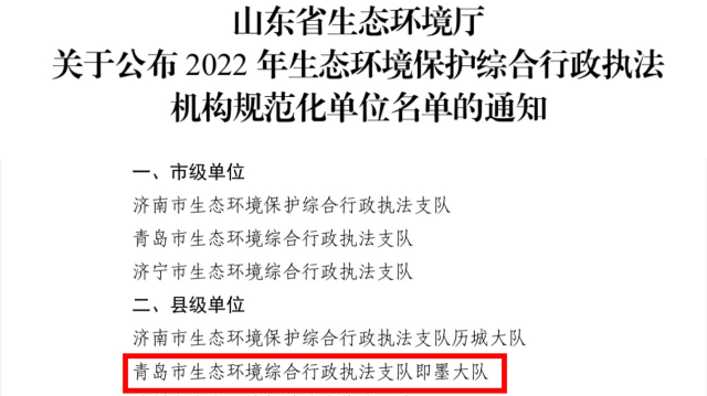 喜報!青島市生態(tài)環(huán)境局即墨分局榮獲省2022年生態(tài)環(huán)境保護綜合行政執(zhí)法機構(gòu)規(guī)范化單位