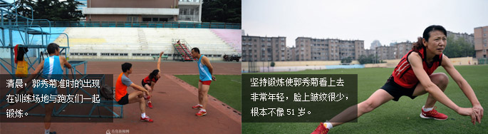 先慢跑五圈,小步跑,高抬腿,弓箭步;再做20個(gè)俯臥撐、50個(gè)杠鈴,之后才是正式訓(xùn)練開始。就是這樣,20年來堅(jiān)持晨跑訓(xùn)練從不間斷,同一訓(xùn)練場地上晨練的跑友們自告奮勇,為郭秀菊當(dāng)起了私人教練和陪練?!?a target="_blank" class="cYellow" >[詳情]