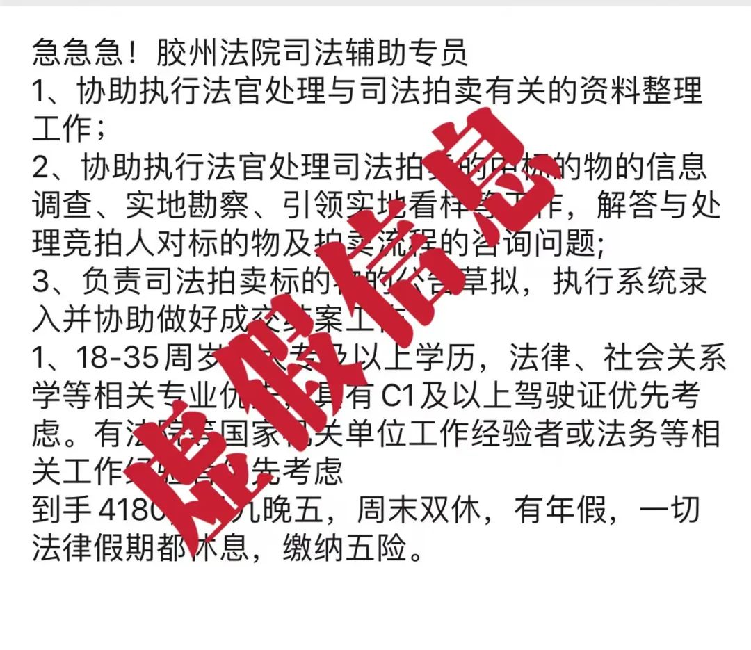 膠州法院嚴(yán)正聲明:網(wǎng)傳“招聘司法輔助專員”信息不實