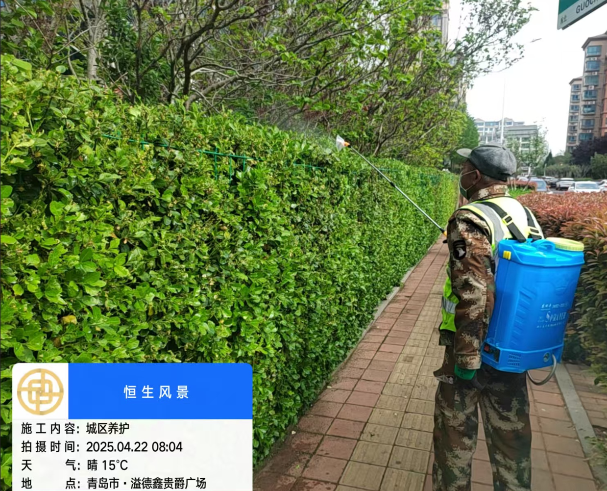 城陽區(qū)一人行道灌木冬青發(fā)生嚴重蟲害 相關部門立即噴藥防治