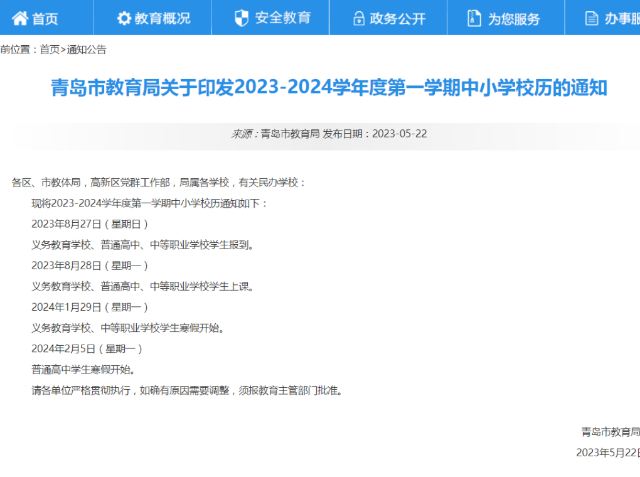 青島中小學暑假開學及寒假時間公布 8月27日返校報到