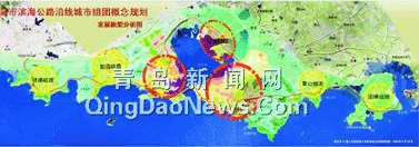 兩點(diǎn)一環(huán):以膠州灣東岸為主城,西岸為輔城,環(huán)膠州灣沿海為發(fā)展組團(tuán),形成“兩點(diǎn)一環(huán)”的發(fā)展態(tài)勢(shì)。